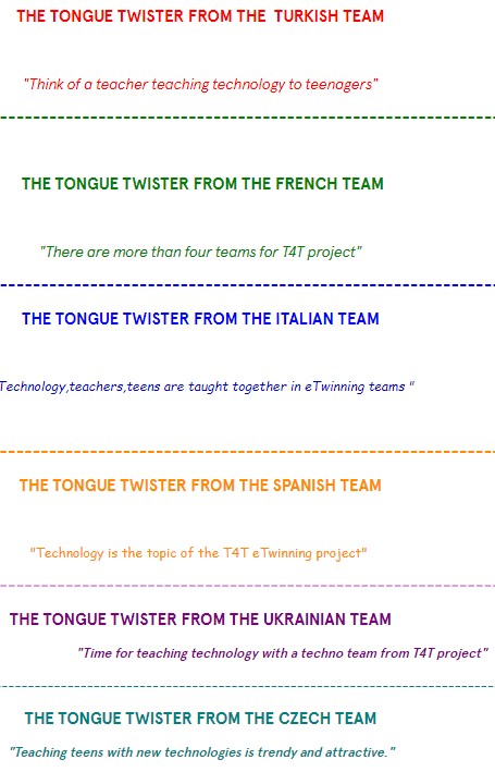 After a short brainstorming in class we chose one "tailor-made" tongues twister and shared it in a common activity in our project twinspace. Then some volunteers read them all aloud and recorded it.